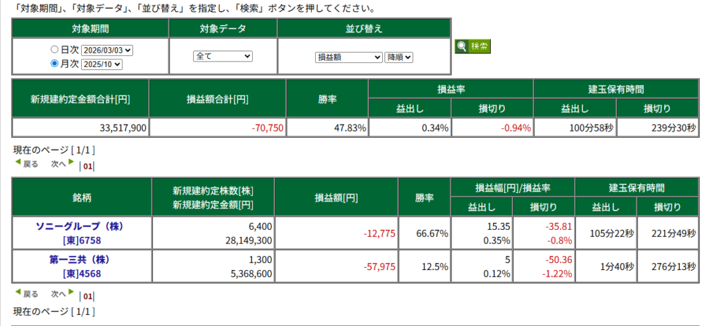 2025年10月 「月間成績」 月末報告 X Facebook はてブ LINE コピー 2026.03.23 仕事の合間に・・。 負けたなー!!マイ転 -70,750円 2025年10月の時点で 1,039,700円-70,750円 資金:968,950円