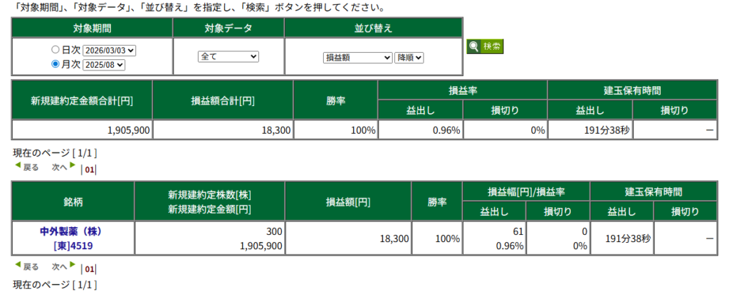 2025年8月 「月間成績」 月末報告 X Facebook はてブ LINE コピー 2026.03.23 記録をたどると一番古いのがこれっだったよう とりあえず松井証券に100万円入金して、いつかデイトレなどしたいと思っていた時期。 2025年8月の時点で 資金:1,018,300円