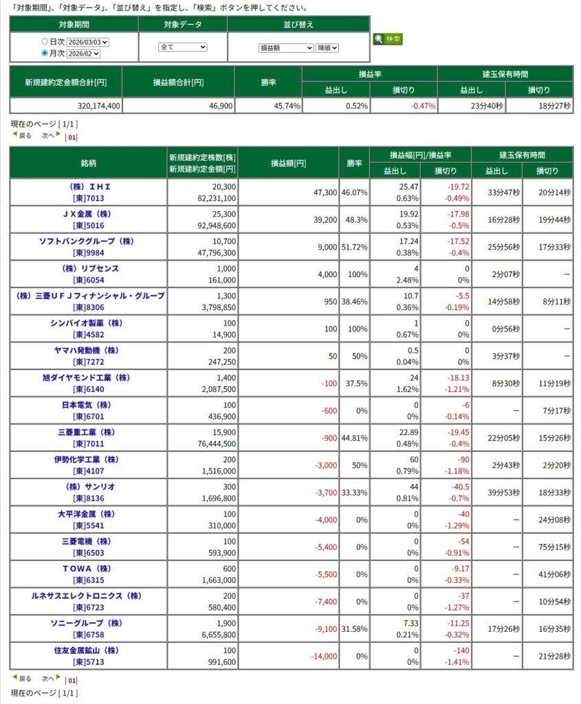 2026年2月 「月間成績」 月末報告 X Facebook はてブ LINE コピー 2026.03.23 1月の大負けを受けて反省しまくり。買ったり負けたり、でも結果プラス! 高市内閣発足で上がりトレンドで勝てた気がする。 +46,900円 2025年2月の時点で 645,850円+46,900円 資金:692,750円