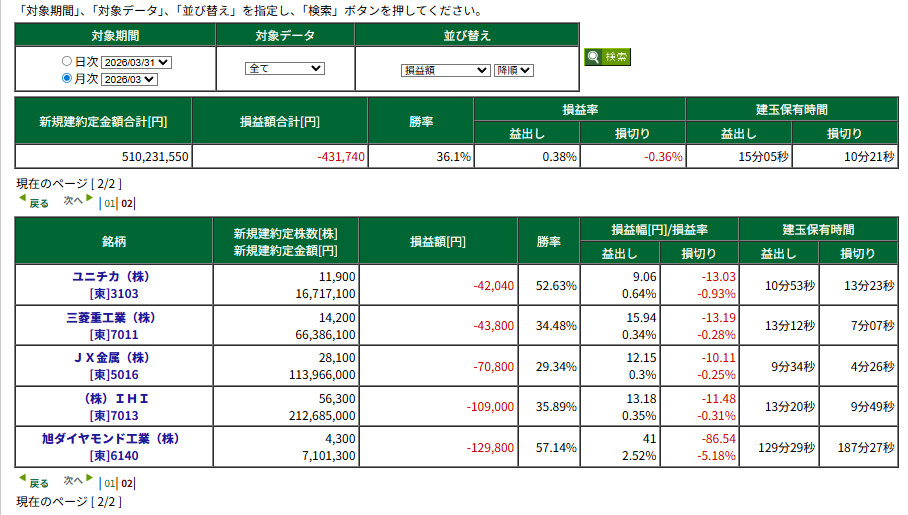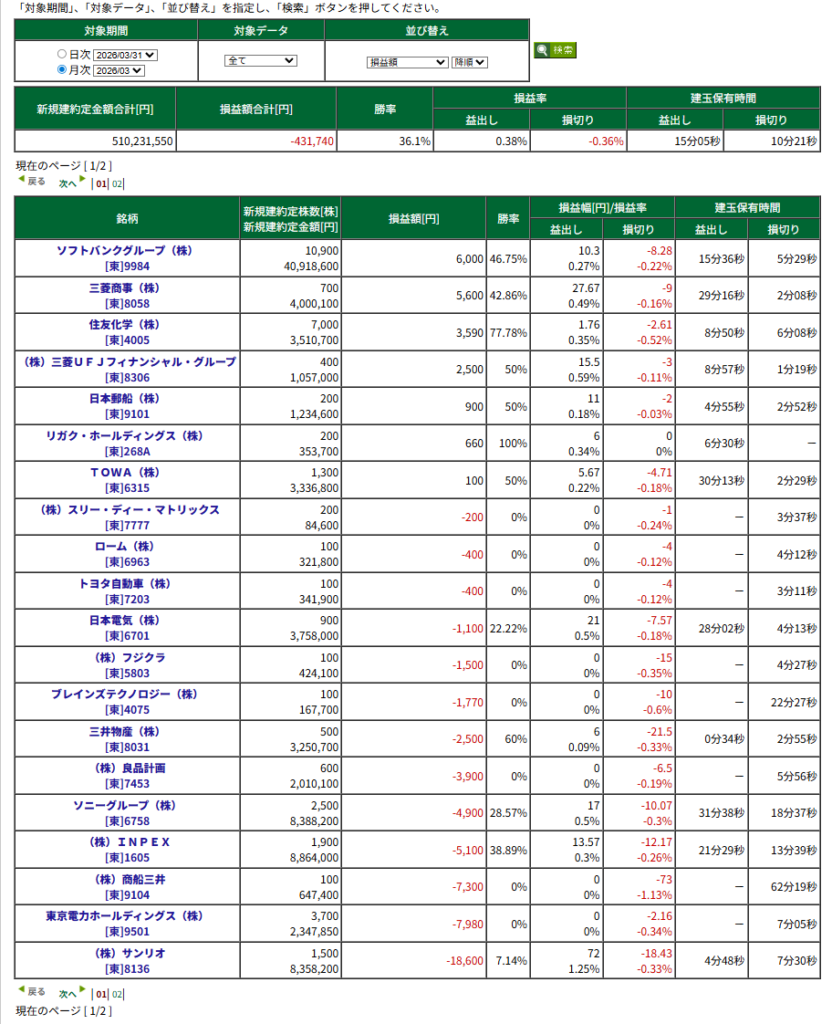 2026年3月 「月間成績」 月末報告 X Facebook はてブ LINE コピー 2026.04.01 負けまくりですわ!! -431,740円 2025年3月末の時点で 692,750円-431,740円 資金:261,010円 あれ?ちょっと計算が合ってない。245,203円じゃなかった。税金の関係かもです。誤差すみません💦