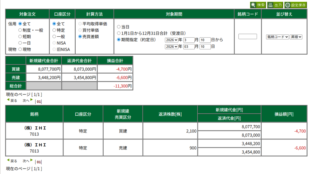 2026/3/10 「いよいよ退場か・・・。」 成績 X Facebook はてブ LINE コピー 2026.03.13 目次 本日の成績 📊 取引概要🧠 今日のポイント👍 良かった点反省点👎 改善点現在の資金の推移 本日の成績 -11,300円 📊 取引概要 銘柄:IHI 🧠 今日のポイント あまりガチャガチャいじらずにじっくりやってみたけど、ダメでした。 👍 良かった点 負けは負けだが一万円ぐらいで済んだことでしょうか? 反省点 損切、利確のタイミングが全然わからない。 👎 改善点 ルール作りが必要ですが、どう設定したらいいかがわからない。 現在の資金の推移 デイトレ用資金:1,000,000円→?円